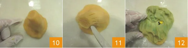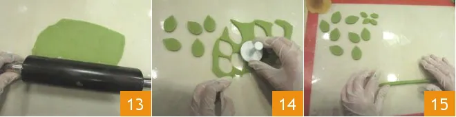 Roll it out to about 1/8 inch thick 13 and, using two leaf-shaped cutters of different sizes, form a dozen leaves 14. Re-knead the scraps and form some cords 15.