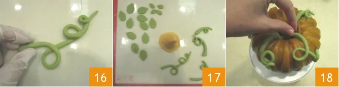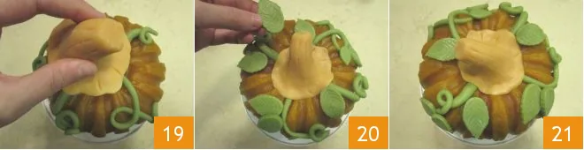 Cover the hole in the ring with the stem, making it adhere well to the cake 19, then decorate the tendrils with the leaves 20. Your Halloween pumpkin cake is ready to be served!