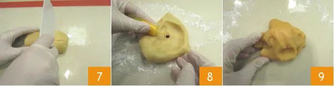 Shape the marzipan into a sausage shape, cut off one end, and flatten the other on the work surface to form a stem, which you will slightly bend to give it more realism 10. With a knife, score the surface vertically to make it ribbed 11. With 2-3 drops of yellow food coloring and a couple of drops of blue food coloring, color the remaining marzipan green 12