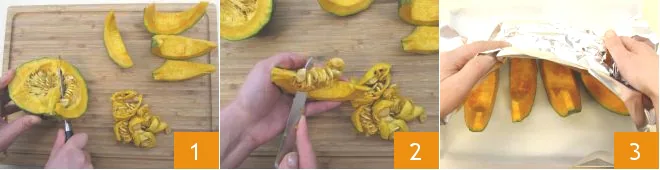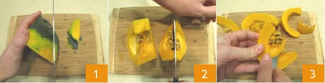 Now focus on the cake: first peel the pumpkin 1 and cut it into wedges 2. Remove the seeds and inner filaments 3