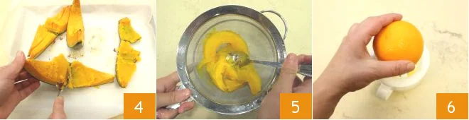 Once cooked, remove from the oven and let the pumpkin cool, then separate the flesh from the skin 4 and pass it through a fine mesh sieve 5. Now squeeze the orange 6