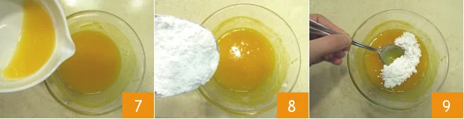 And add the juice to the sieved pumpkin flesh 7. Gradually add the powdered sugar 8, stirring carefully 9 until you get a glaze of the right consistency. It should not be too stiff, but also not excessively fluid. Set it aside.