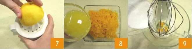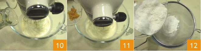 While continuing to whip, slowly add the oil in a thin stream 10 and also add the grated orange zest 11. Separately, sift together the flour, baking powder 12