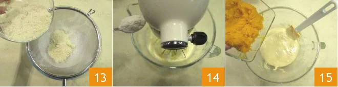 And almond flour 13. Mix well and while continuing to whip, add the flours to the mixer one tablespoon at a time, adding the next only when the previous one is fully incorporated 14. When you have used all the flours, remove the bowl from the mixer and add the grated pumpkin to the mixture 15.