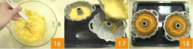 Gently fold with upward movements using a spatula 16 until you get a homogeneous mixture. Weigh it and divide it into 2 greased and floured fluted ring molds of 8 inches in diameter 17. Bake the cakes in a preheated static oven at 350°F for 40 minutes, then remove from the oven and let them cool.