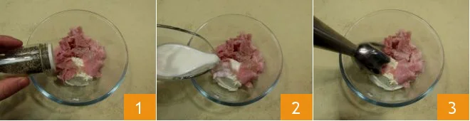 To prepare the ham and arugula swirls, start with the filling. In a bowl, place the robiola cheese, coarsely chopped ham, salt, and pepper 1. Lastly, add the milk 2 and begin to blend the ingredients with an immersion blender 3.