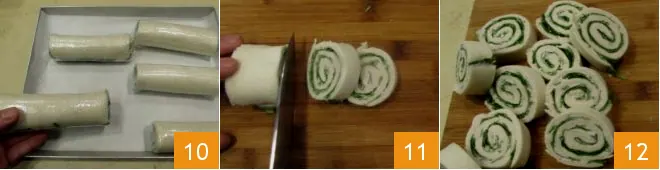 Individually wrap the rolls in plastic wrap 10, place them on a tray or dish, and let them rest in the refrigerator for at least 30 minutes. After the necessary time, gently remove the plastic wrap and cut them into slices about 0.4 inches thick 11.