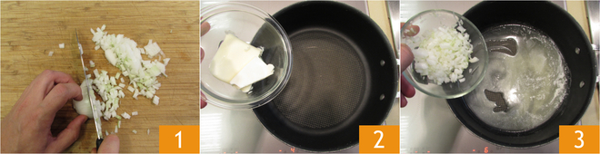 To prepare the ham croquettes, finely chop an onion 1. Melt the butter in a saucepan 2 and stew the onion for 10 minutes over medium-low heat 3.