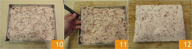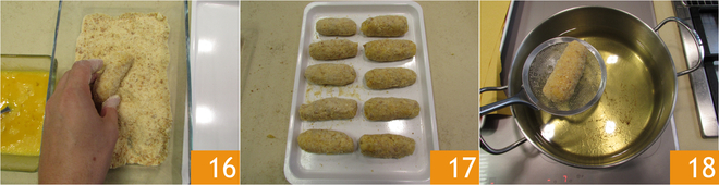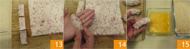 With a knife, cut out 10 equal rectangles 13. Shape them into croquettes by molding them with damp hands. Dip the croquettes first in beaten eggs 15