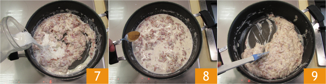 Pour in the milk in three additions 7 and flavor with nutmeg 8. You need to obtain a very thick béchamel, which will take at least 6 minutes 9.