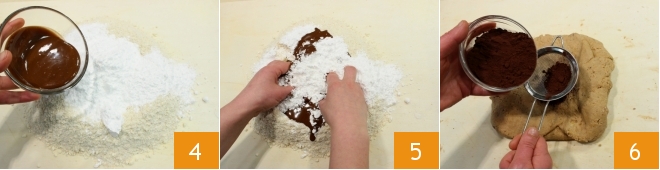 Then also add the hazelnut paste 4 and start kneading 5, until you get a compact and smooth consistency. Sprinkle the shortcrust dough with the sifted bitter cocoa 6.