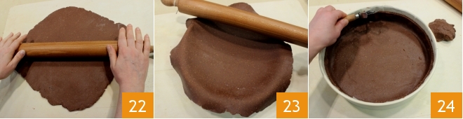 Retrieve the shortcrust dough and roll it out with a rolling pin 22 to obtain a disc about 1/4 inch thick. Roll it onto the rolling pin and place it on a 11-inch diameter tart pan previously buttered and lined with parchment paper 23. Make the shortcrust pastry adhere perfectly to the bottom and sides, then trim the edge with a smooth pastry wheel 34