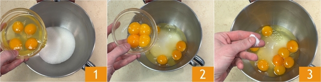 To prepare the hazelnut and chocolate filled cake, start by pouring the whole eggs and sugar into the bowl of the stand mixer (you can use electric beaters and a large bowl as an alternative) 1. Add the yolks 2 and a pinch of salt 3.