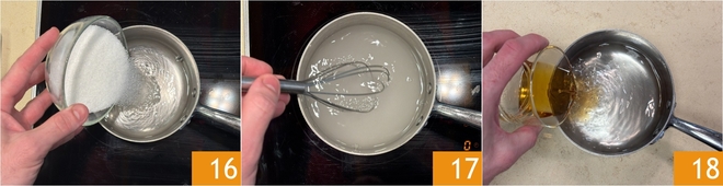 Prepare the soaking syrup. In a saucepan, pour water and sugar 16, stir and bring to a boil 17. Then turn off the heat, let it cool and then add the rum; the syrup is ready 18.