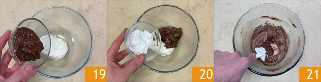 Now take care of the filling. In a bowl, pour the mascarpone, hazelnut cream 19 and powdered sugar 20, work with the spatula to blend 21.