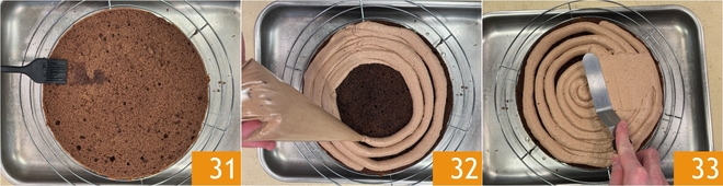 Brush with the soaking syrup 31 and fill with slightly more than half of the cream that you have placed in a piping bag 32. Spread to level 33.