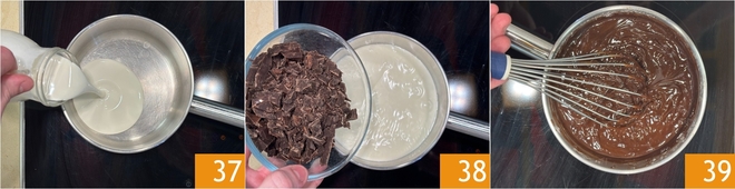 Heat the cream in a saucepan 37, when it reaches a boil, turn off the heat and add the chopped chocolate 38. Stir until completely melted 39.