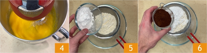 Beat for at least 10 minutes or until the mixture is light and fluffy 4. Meanwhile, sift the flour and potato starch into a bowl 5 and add the cocoa powder 6.