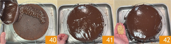 When the ganache reaches a temperature of about 122°F, pour it over the cake 40 and shake the rack to level the coating 41. Finally, garnish with hazelnut crumbs all around 42.