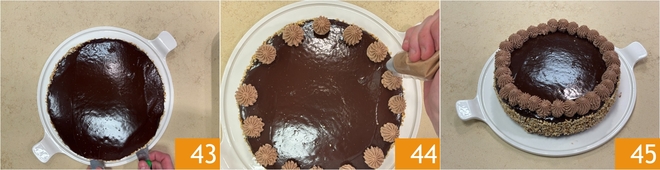 Transfer the cake with two spatulas onto the serving plate and allow the glaze to set in the fridge, about half an hour 43. Transfer the remaining cream into a piping bag with a star nozzle and pipe dollops for decoration 44. Your hazelnut and chocolate filled cake is ready 45.