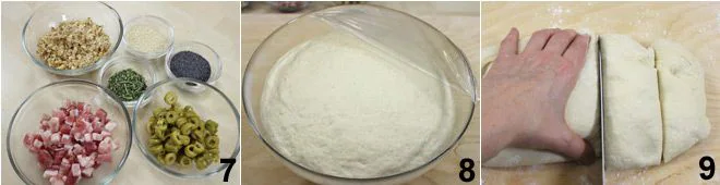 You should then have many small buns with bacon, olives, walnuts, rosemary, etc. Always set aside small quantities of ingredients to garnish the surface of the buns before baking. When you have formed all the buns, brush them with milk (or cream), put a little of the ingredient contained in the bun dough on top, and then let rise for about 30 minutes in the oven off but with the light on. When the buns have doubled in volume, they will be ready to be baked in a preheated oven at 390°F (200°C) for about 25 minutes.