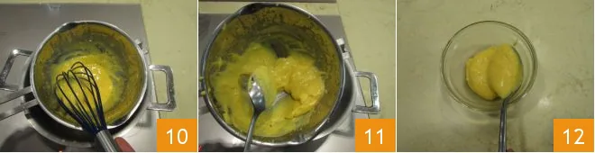 You will notice that the sauce will start to change color 10, becoming lighter, along with its consistency 11. It takes about 5 minutes of cooking over low heat, continually stirring, to achieve hollandaise sauce 12.