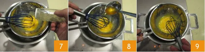 Add white pepper 7, then slowly pour in the clarified butter (if you prepared it earlier, it might have solidified, so let it melt for a few moments before pouring) 8 and keep beating 9.