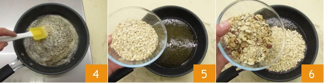 Cook for 10 minutes over medium heat to create a syrup 4, then turn off the heat and add the rolled oats 5 and chopped nuts 6.