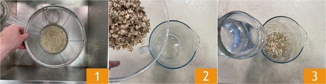To prepare oat milk, first, rinse the oats thoroughly under running water 1 multiple times, until the water runs clear. At this point, transfer the oat flakes into a jug 2 and add one liter of water 3.