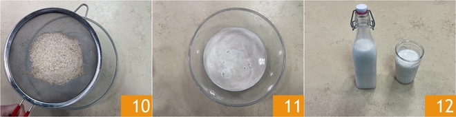 The blended oat flakes will remain in the sieve 10 (you can use them, as advised!), while what is in the bowl will be the oat milk 11. Store it in a glass bottle or enjoy it immediately 12.