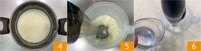 After the cooking time has elapsed, turn off the heat and let it cool for at least 20 minutes 4. At this point, transfer the rice and its cooking water into a pitcher and blend with an immersion mixer 5. If the mixture is too thick, dilute it by gradually adding water 6; we added about 1 2/3 cups of water.