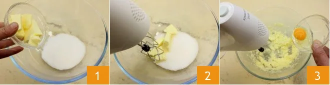 To prepare the honey and poppy seed cookies, place the granulated sugar and room temperature butter cut into chunks in a large bowl 1. Mix with an electric mixer 2 and then add the whole room temperature egg 3.