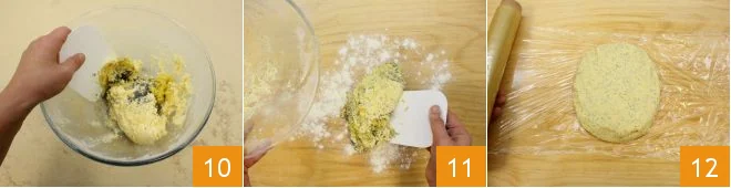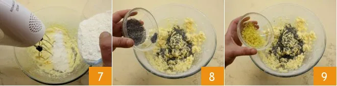 Gradually add the sifted powders to the sugar and butter mixture 7 and mix to obtain a light and fluffy dough; add the poppy seeds 8 and the grated lemon zest 9.