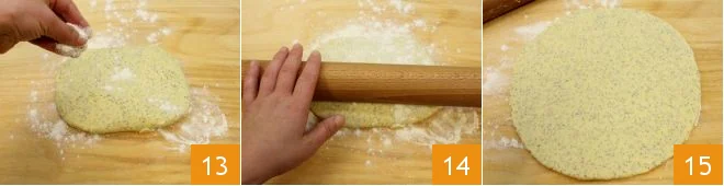 After the necessary time has passed, place the dough on a floured work surface; sprinkle it with a bit of flour 13 to prevent it from sticking, and use a rolling pin to roll it out 14 to a thickness of about 1/4 inch 15.