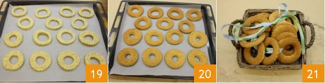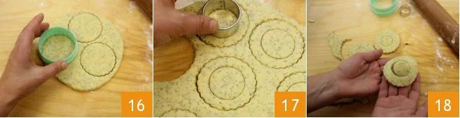 Take a cookie cutter with a diameter of about 2 3/4 inches and cut out disks 16: with our quantities, you should get about 30 cookies. With a 1 3/4 inch cookie cutter, cut out the center of each disk to create smaller circles 17. Gently remove the inner disks with your hands 18 and re-knead them to form a dough ball; cover again with plastic wrap and let rest in the refrigerator for at least 15 minutes, then repeat the operation until the dough is finished.