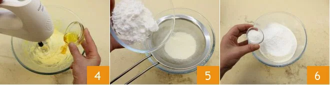 When the egg is incorporated into the dough, pour in the honey 4, continuing with the beaters to mix all the ingredients well. In a separate bowl, sift the flour together with the cornstarch 5 and the baking powder 6.