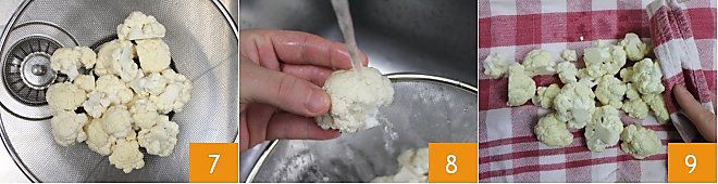 Once the operation is complete, place the florets in a colander 7 and rinse them one by one under cold running water 8. Finally, dry them with a clean cloth 9.