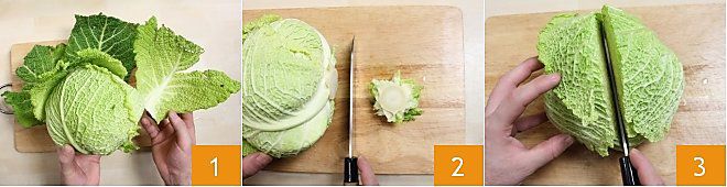To prepare the savoy cabbage, start by removing the outer leaves if damaged and not firm 1. Place it on a cutting board and, holding it firmly with one hand, remove the final part 2, split it in half with a knife down to the end of the stem 3.