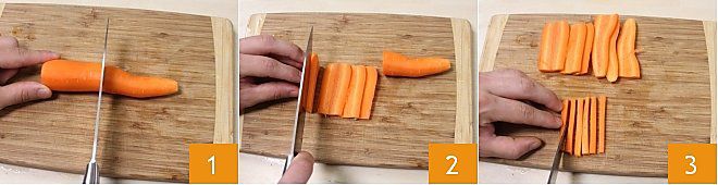 THE STICK CUT Cutting vegetables into sticks is particularly suitable for wok cooking. To achieve this cut, you start from the thin slices cut. Let's see how to do it. Wash and peel a carrot, then place it on a cutting board and divide it in half 1, cut each half into thin slices along the length 2, then cut each slice into sticks about 1/4 inch wide 3.