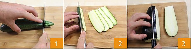 THE THIN SLICES CUT This cut is usually used for grilling preparations and is done by cutting the vegetable along the grain to prevent the slices from falling apart during cooking. Let's see how to do it. Wash and dry, for example, a zucchini or an eggplant, place them on a cutting board, and remove the ends 1, then with a well-sharpened knife, cut them into slices along the length (2-3), obtaining long, thin slices.