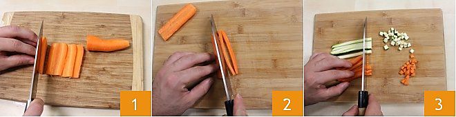 THE BRUNOISE CUT The brunoise cut consists of obtaining small vegetable cubes, about 1/12 inch per side, starting from the stick or julienne cut, and is ideal for preparing cooking bases or using as decoration for dishes. Let's see how to do it. Starting from the slices cut 1, obtain sticks 2, and then reduce the sticks into very small cubes about 1/12 inch per side 3.