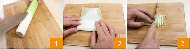 THE CHIFFONADE CUT The chiffonade cut allows you to cut leafy vegetables into perfect strips, and this cut also serves to make even simple salads perfect. Let's see how to do it. The chiffonade cut can be used for wide-leaf vegetables, such as chard or lettuce, and it is perfect for leeks as well. In the case of the latter, remove the ends and cut the stalk to obtain the leaves 1, fold the obtained leaf into three parts 2, and cut thin strips that will be perfect for decorating salads, savory pies, and soups!