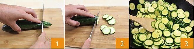 THE RONDELLE CUT The rondelle cut is usually used for cutting vegetables that have a narrow and elongated shape (such as zucchini or cucumbers) and is ideal for pan cooking because the limited thickness of the slices allows for faster and more even cooking. Let's see how to do it. Wash and dry, for example, a zucchini, place it on a cutting board, and remove the ends 1, then proceed to cut it into more or less thin rondelle depending on the recipe you need to prepare 2: thicker if you need to sauté them in a pan 3, thinner if you use them to prepare an omelet.