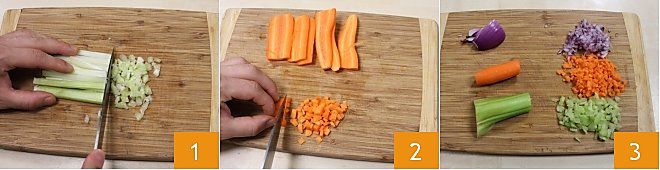 THE MIREPOIX CUT The mirepoix cut refers to the dicing of celery, onion, and carrot, a mix usually used for the preparation of soffritto. This cut is named after its creator, the Duc de Lévis-Mirepoix. Let's see how to do it. To prepare the mirepoix cut, proceed by dicing celery, carrots, and onions, obtaining the classic soffritto mix (1-2-3).
