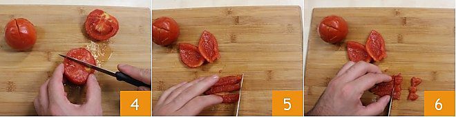 Cut the tomatoes in half and then into quarters, then remove all the seeds 4. Cut each tomato into strips about 1/5 inch per side 5. At this point, you can make cubes 6 that will be useful for preparing sauces, bruschetta, or decorations.
