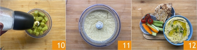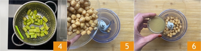 Boil or steam them until they are tender 4. Place the chickpeas in a blender container 5, add the tahini 6 and, if you prefer, garlic with the core removed.