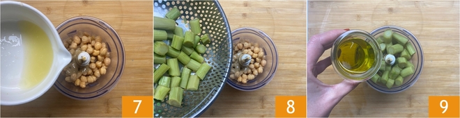 Add the juice of half a lemon 7, the artichoke stems 8, and half a cup of oil 9.