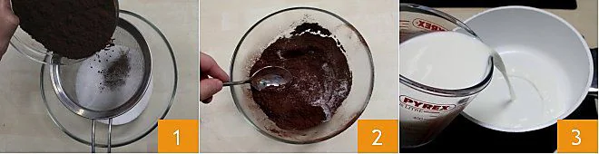 To prepare the iced mocha, start with the chocolate: in a bowl put the sugar, add the sifted unsweetened cocoa powder 1, and mix with a teaspoon 2, then pour the cold milk into a saucepan 3.