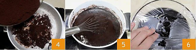 Now add the cocoa mixed with sugar to the milk 4 and dissolve them by stirring with a whisk to eliminate lumps 5. Then turn on the heat. When it begins to boil, reduce to a simmer and let it cook for 10 minutes. Once ready, pour the chocolate into a bowl and cover it with cling film in contact 6, let it cool at room temperature and then put it in the fridge for 2 hours to thicken.