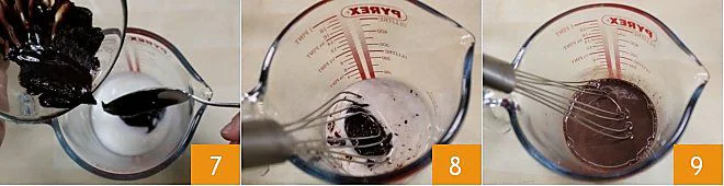 After the necessary time, take the chocolate out of the fridge. In a container, pour 200 ml (about 0.85 cups) of cold milk, add 200 g (about 7 oz) of cold chocolate (keep the rest aside for the final garnish) 7, mixing to temper it 8 until you get a thick and homogeneous mixture and set it aside 9.